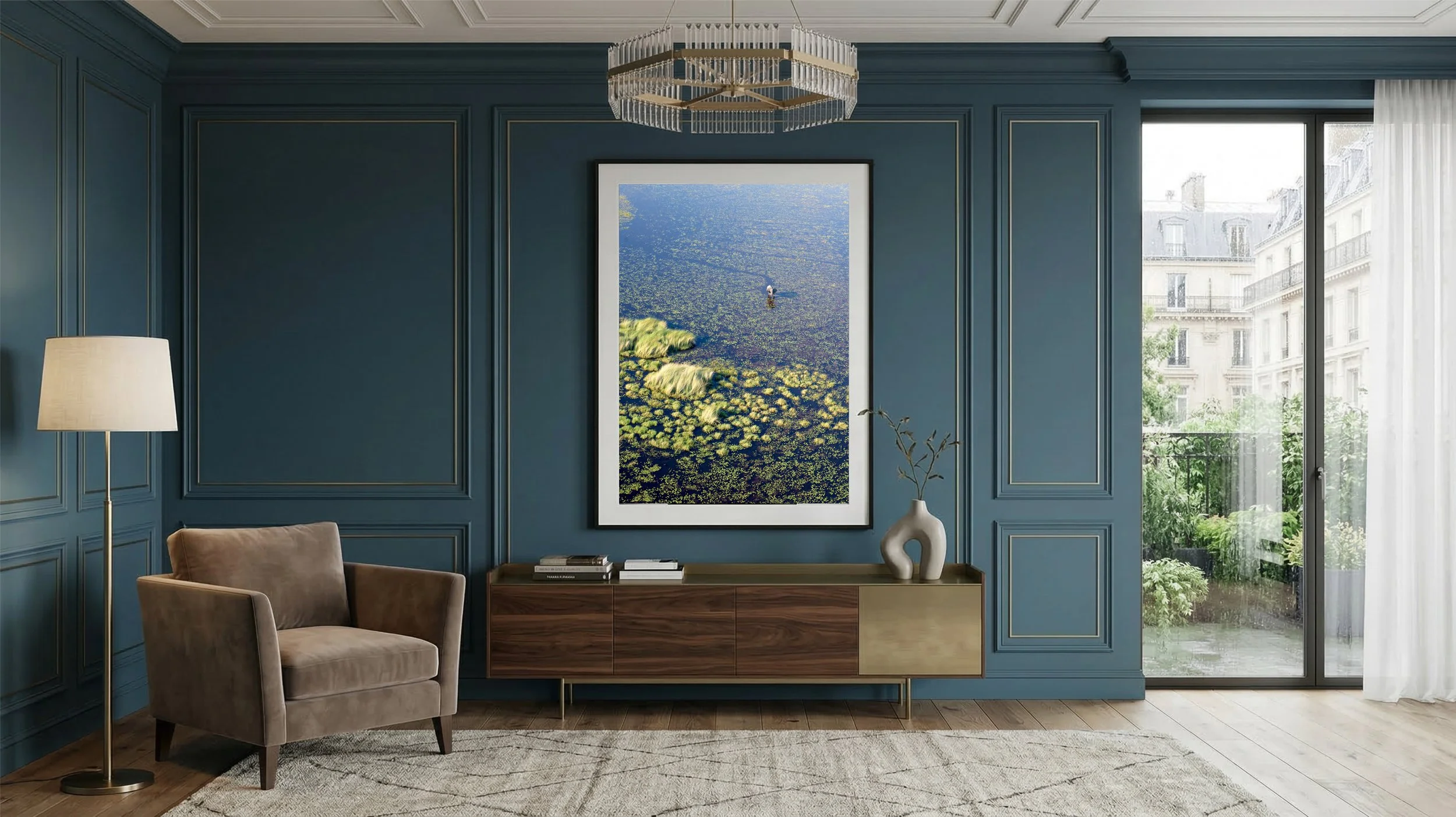 A solitary giant wades through the mirror-like channels of the Delta. A quiet, powerful study of sculptural form, monumental scale, and unwavering persistence.