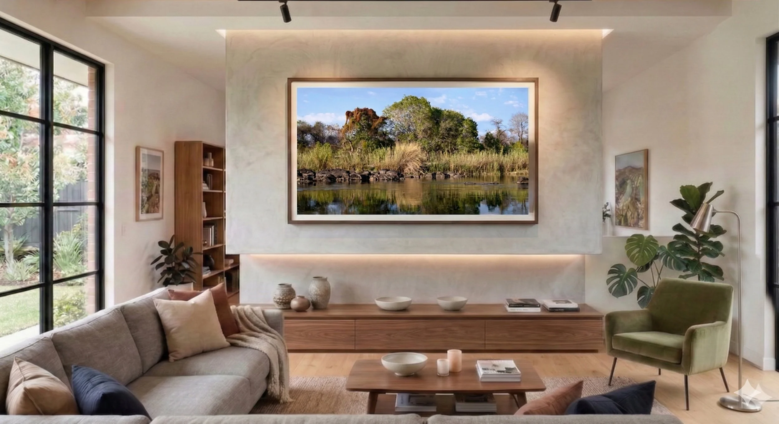 The Zambezi River captured in a moment of absolute stillness. A flawless natural mirror reflecting the intricate architecture of stone, flora, and sky.