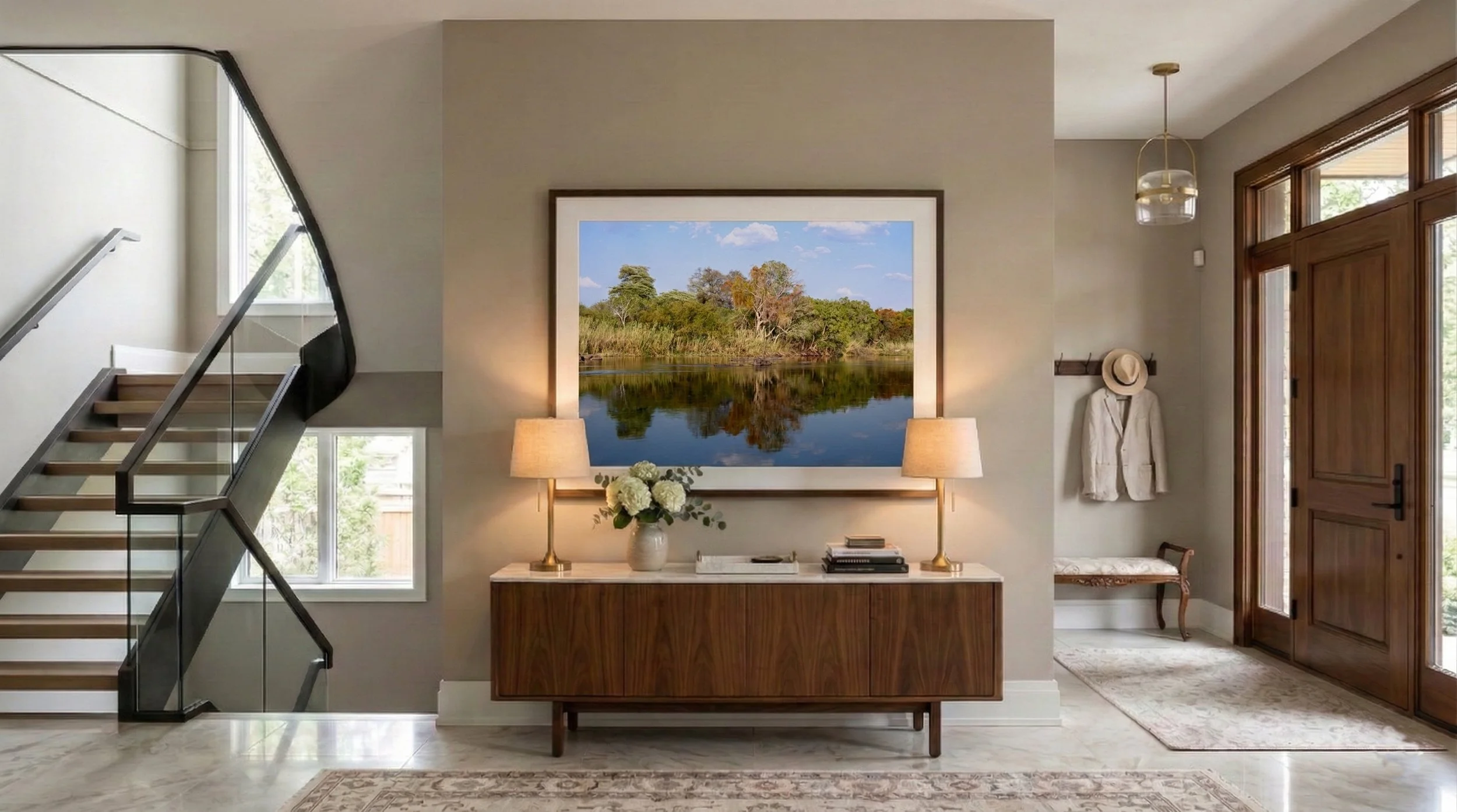 The final piece in the Zambezi River series continues the profound exploration of stillness. Here, scattered stones gently break the mirror-like surface of the water, anchoring a vibrant, layered tapestry of wild foliage. It is a quiet meditation on the enduring tranquility and structural beauty of the African riverbanks.