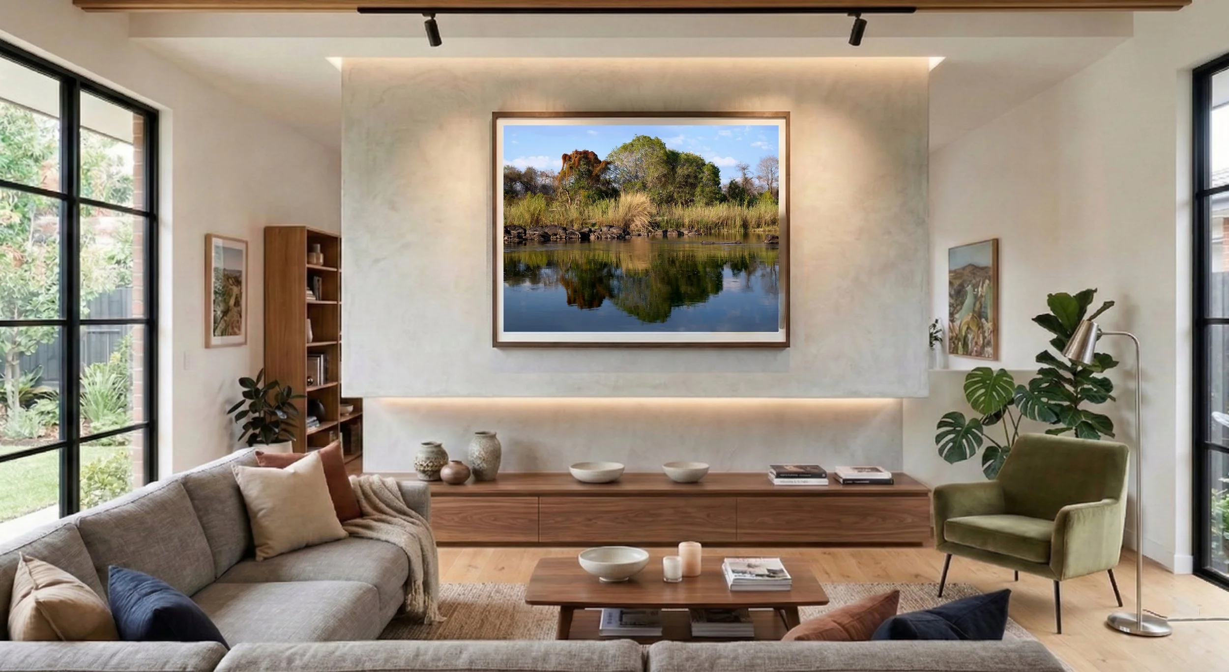 The Zambezi River captured in a moment of absolute stillness. A flawless natural mirror reflecting the intricate architecture of stone, flora, and sky.